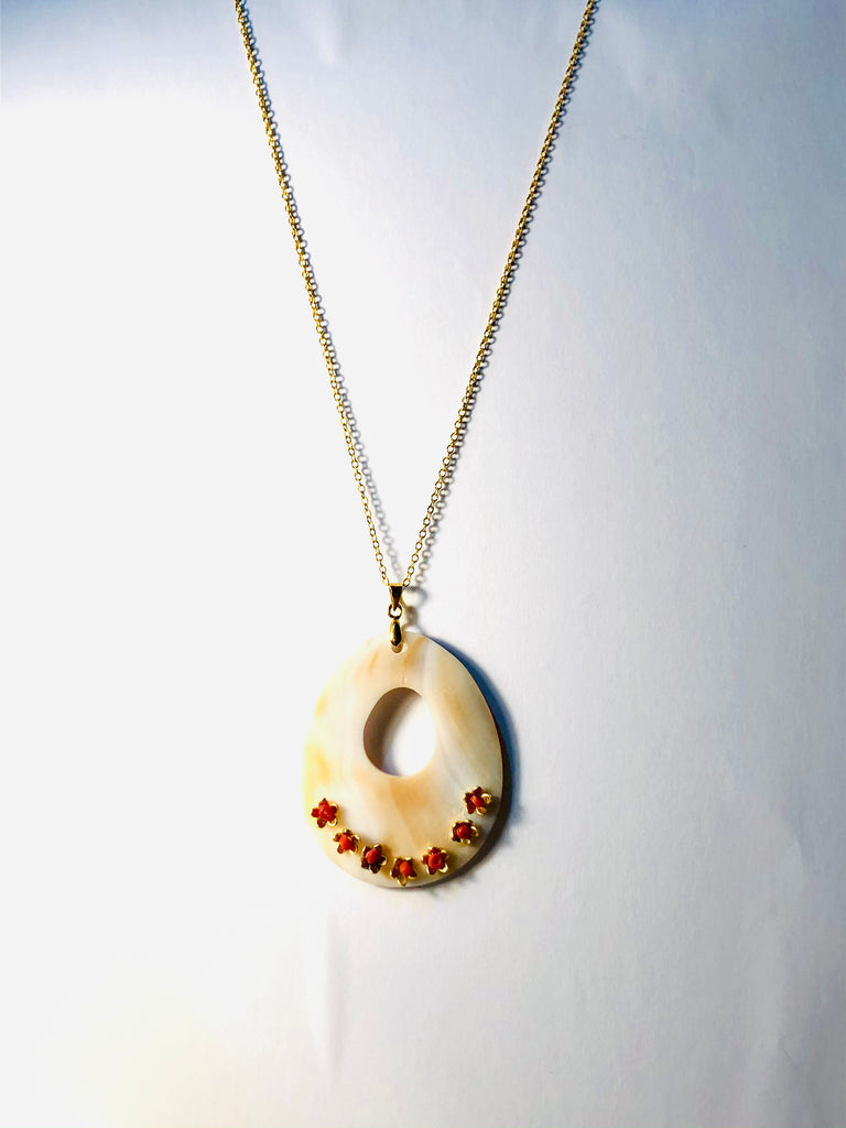 Pretty shell pendant with tiny gold metal and bead flowers in a row.